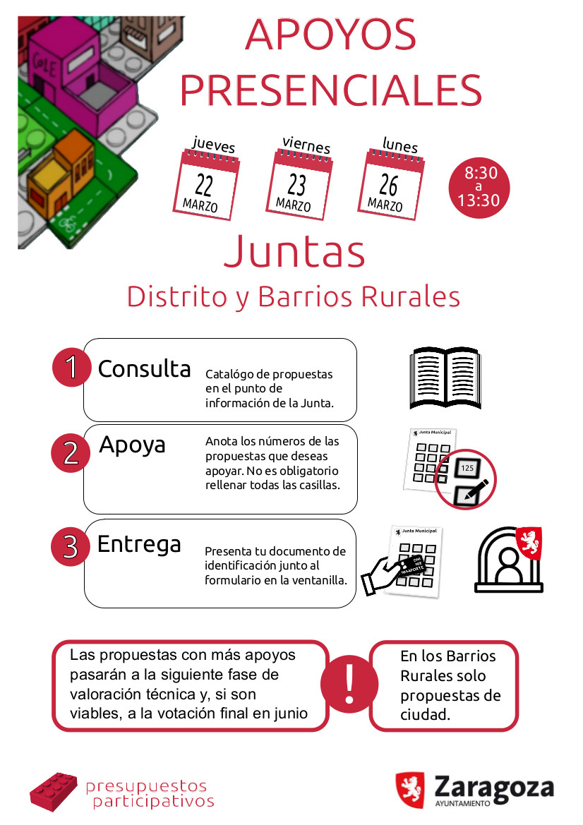 También puedes realizar apoyos presenciales los días 22, 23, 26 de marzo en horario de 8:30 a 13,30 h. en las Juntas Municipales (para las propuestas de Distrito y de Ciudad), para ello tendrás que rellenar el siguiente formulario en base a la relación correspondiente a la totalidad de las propuestas de distrito y de ciudad que están en fase de apoyos, cada una de las cuales tiene asignado un número de identificación.