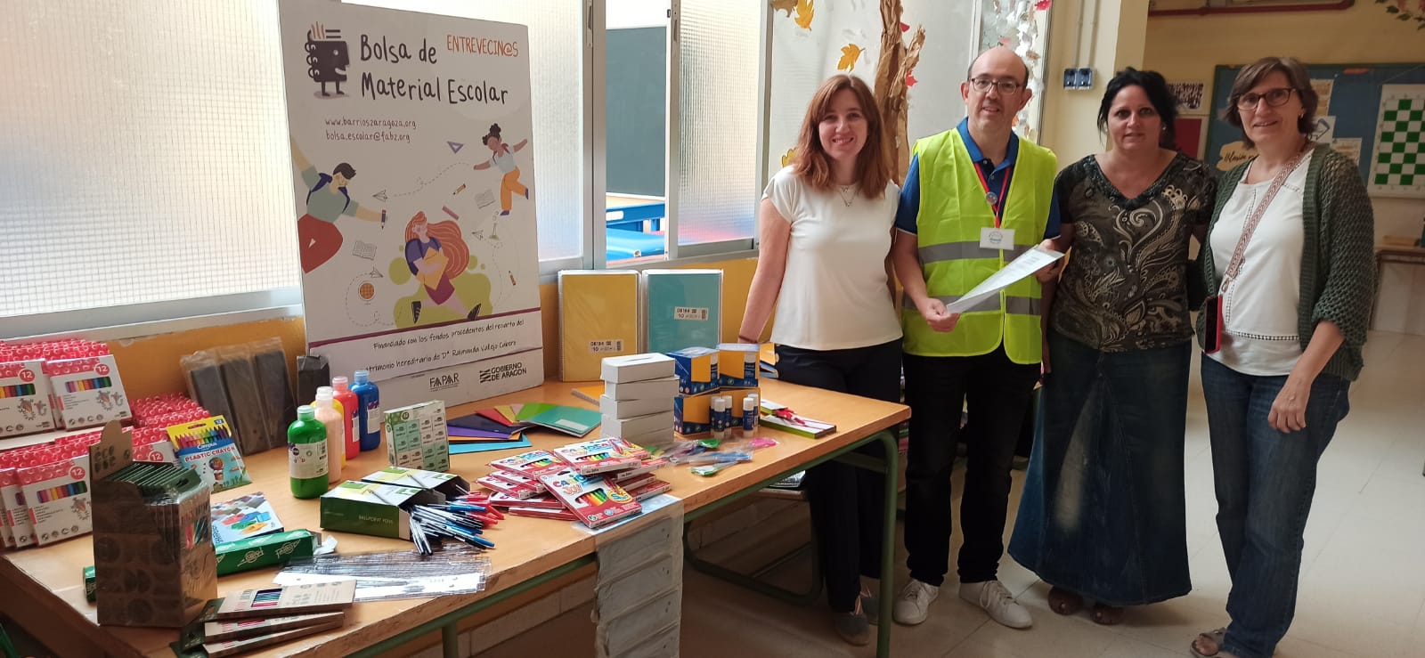 El proyecto solidario Bolsa de Material Escolar 2023 de la Federación de Asociaciones de Barrios de Zaragoza (FABZ) en colaboración con la Federación de Asociaciones de Padres y Madres de Alumnos de la escuela pública de Aragón (FAPAR), ha entregado el material escolar solicitado por los Centros Educativos públicos en nuestro Barrio: los colegios Hilarión Gimeno y Marie Curie.