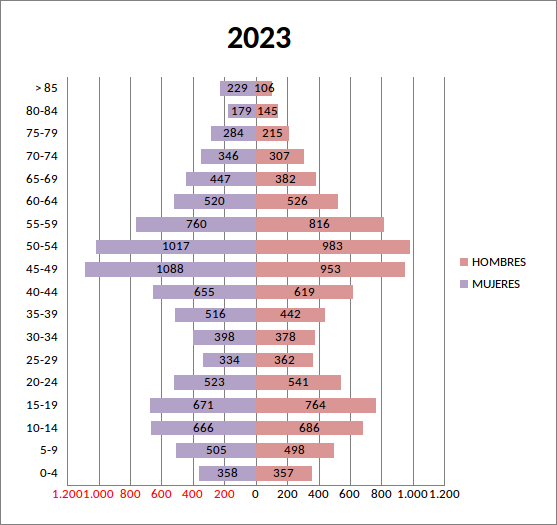La media de edad es de 41,27 años, con mayor predominio de la mujeres, cuanto más edad tienen los vecinos. Un 23,17% de la población (4.385) es menor de 20 años, un 15,33% (2.902) es menor de 15 años, en cuanto población juvenil se refiere, y un 14,79% (2.799) es mayor de 65 años, encontrándose en el tramo de los 50-59 años el grupo con mayor población, con 2.138 vecinos (11,30%).