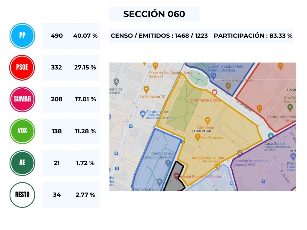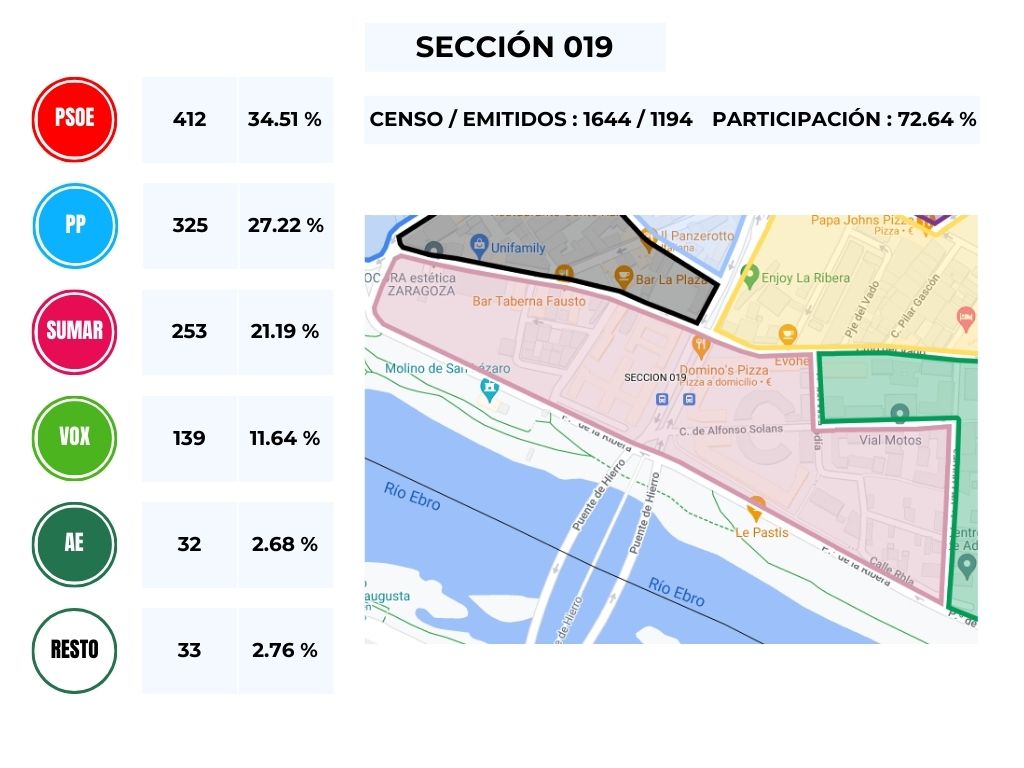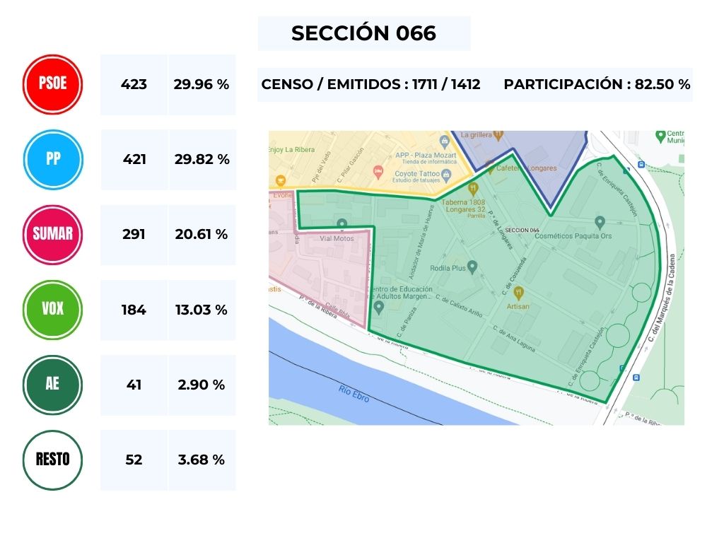 Se puede comprobar que el Partido Popular resulta ganador en las secciones que corresponden con la Azucarera y el Paseo Longares, mientras que el PSOE se hace con las secciones que corresponden al Barrio Histórico del Barrio Jesús, destacamos la sección 066, conformada por la parte nueva del final del Paseo Longares junto con el final de Camino del Vado, que por apenas 2 votos cae del lado del PSOE, .