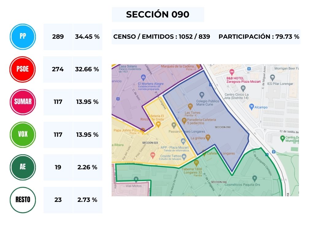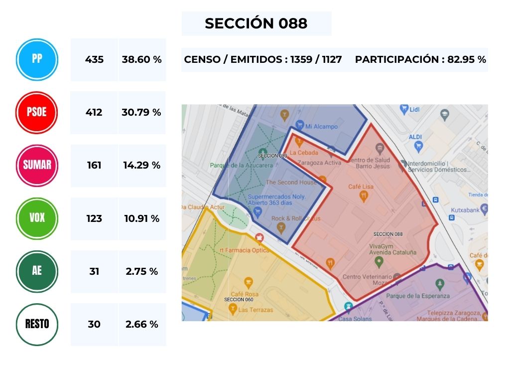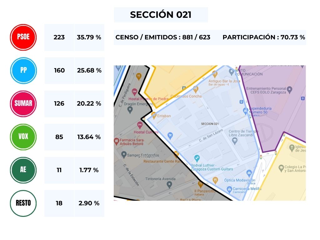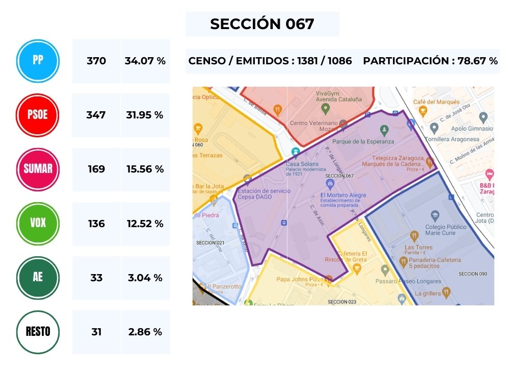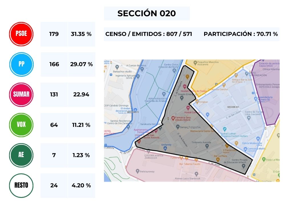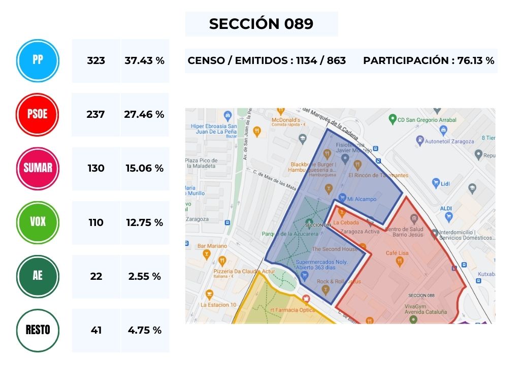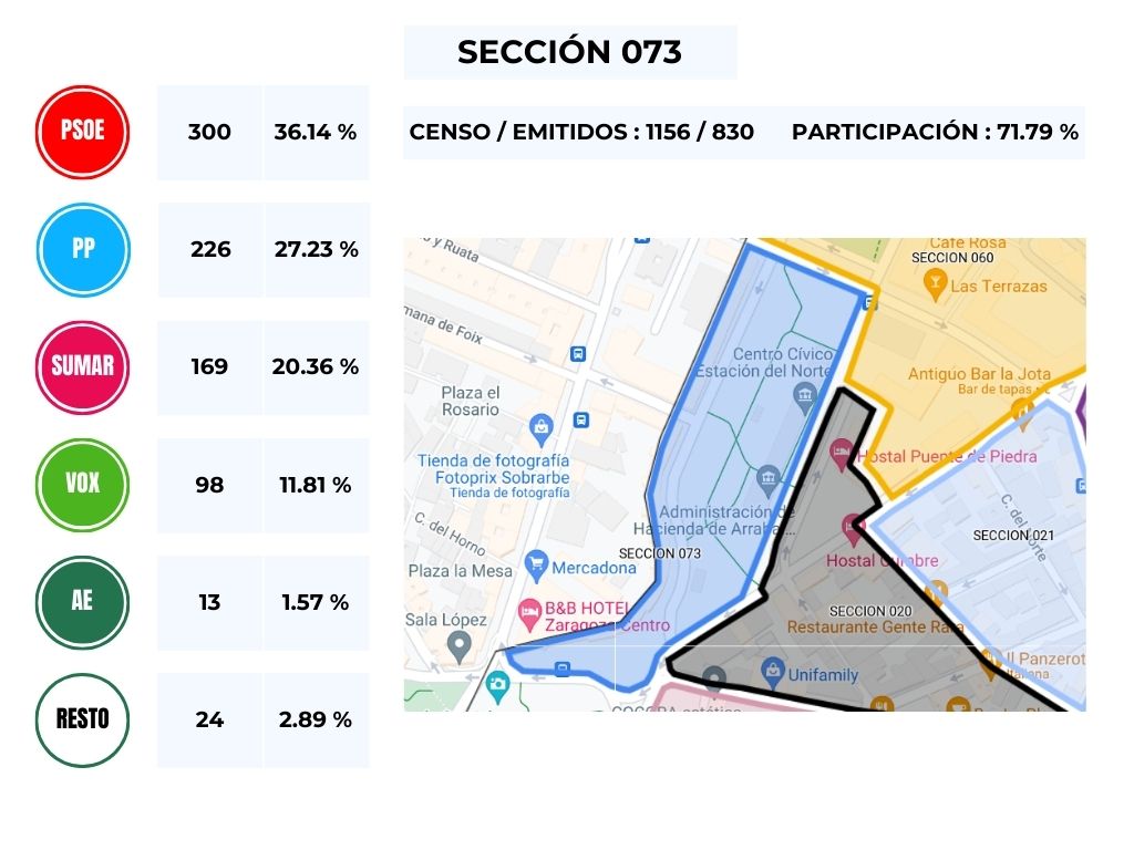 No obstante, y en vista del resultado obtenido en las distintas mesas del Barrio, podemos comprobar que es un calco de lo obtenido en la circunscripción de Zaragoza, en donde, y teniendo en cuenta el número de escaños la derecha gana con 4 diputados, frente a los 3 de los partidos de izquierda.