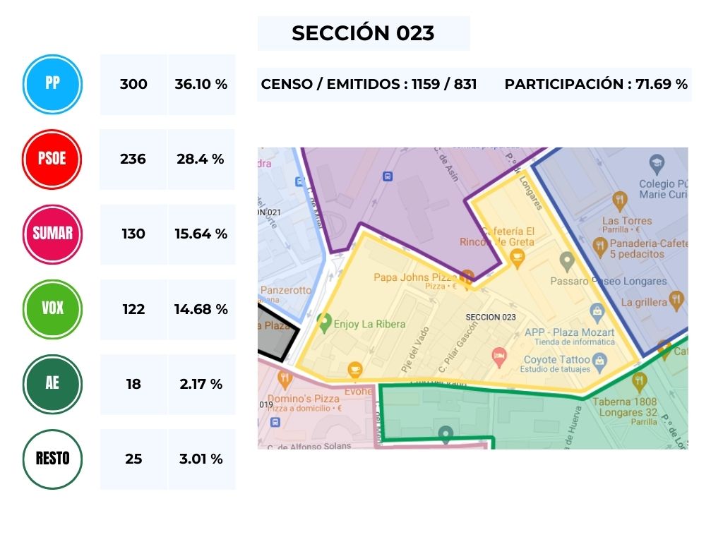 Datos de las distintas mesas de las elecciones municipales 23J, agrupadas por Sección.