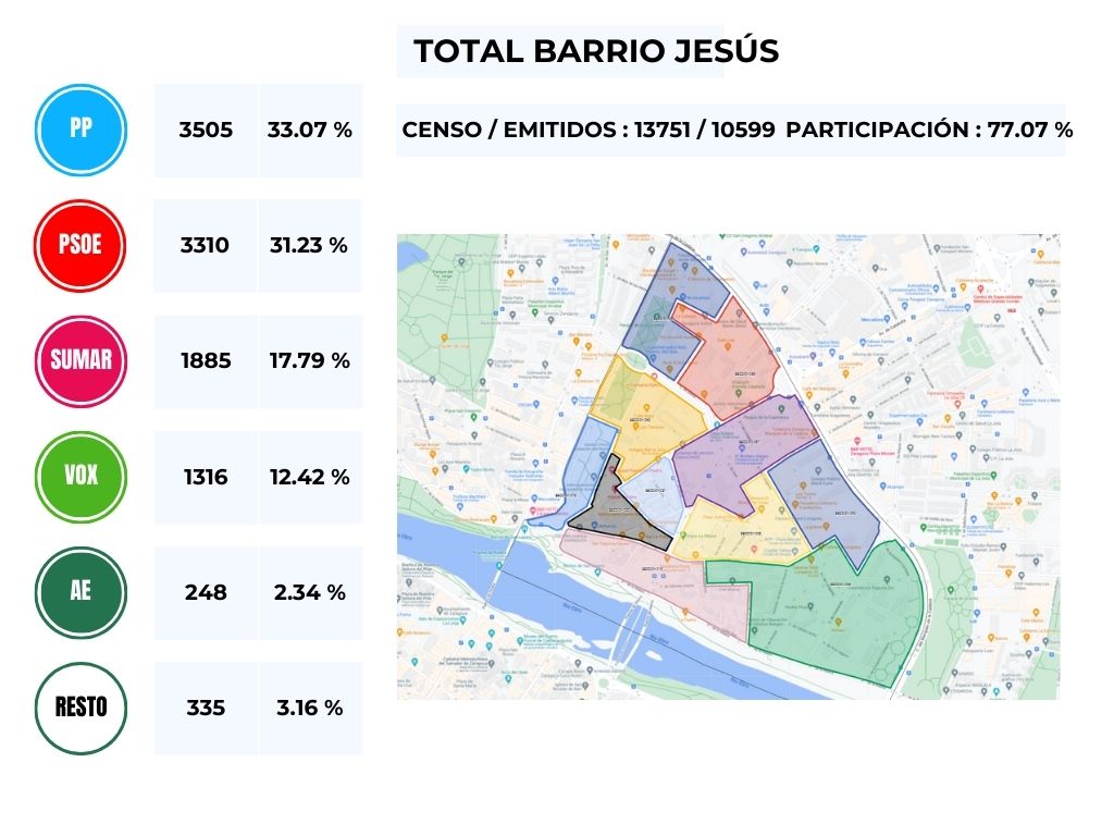 Desde la Asociación de Vecinos Barrio Jesús hemos disgregado los resultados de las Elecciones Generales 23J, de las distintas mesas electorales del Barrio Jesús, agrupadas por la sección censal de voto.