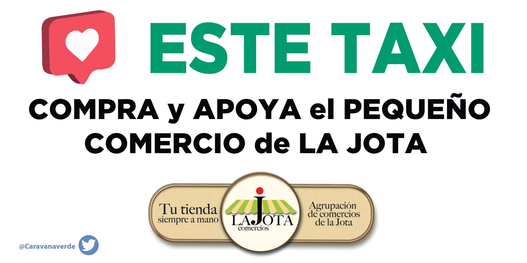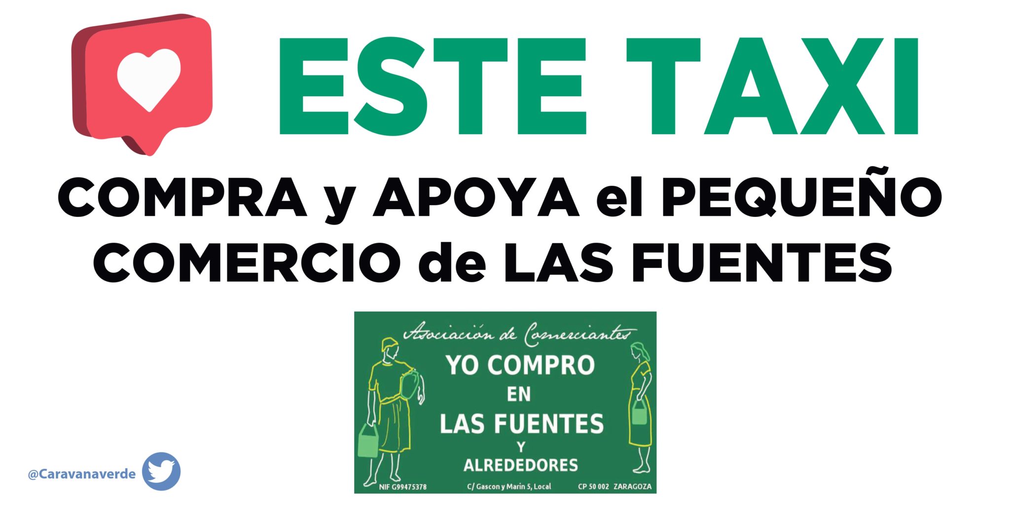 Caravana Verde, colectivo zaragozano del taxi, junto con las asociaciones del pequeño comercio de «San José Barrio Comercial», «Yo compro en Las Fuentes y alrededores», «Comercio del Gancho Casco Histórico», «La Jota comercios» y «Pequeño Comercio del Barrio Jesús», presentan el próximo viernes día 29 de mayo, a las 12 horas, frente al Pabellón Príncipe Felipe la campaña «Este taxi compra y apoya al pequeño comercio«.