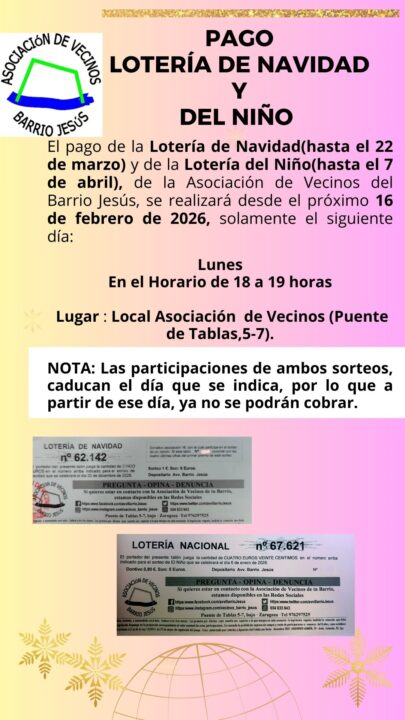 A partir del 16 de febrero realizaremos el pago de la Lotería de Navidad y la del Niño, en local de la Asociación, calle Puente de Tablas 5.7.