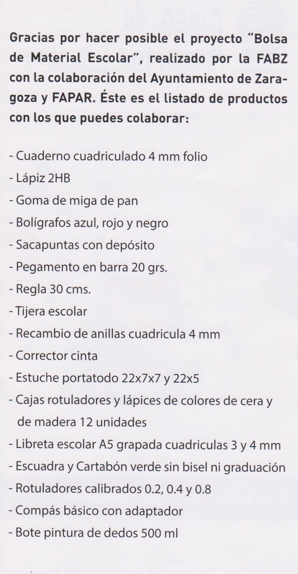 Quienes quieran contribuir a este proyecto solidario podrán hacerlo a partir del lunes 15 de junio en cualquiera de las más de 150 papelerías de todos los distritos y barrios rurales de Zaragoza que ya se han adherido, y en otras muchas que todavía pueden sumarse. En ellas, con la aportación económica que cada persona desee, se podrá adquirir material escolar (entre un listado de productos previamente seleccionado como material de uso básico por parte de la comunidad educativa) que posteriormente será recogido por el voluntariado de la FABZ y entregado a familias vulnerables de colegios públicos y concertados.