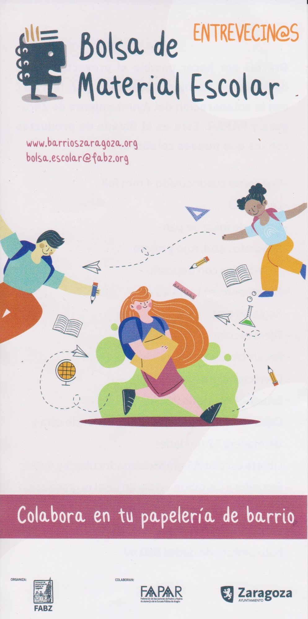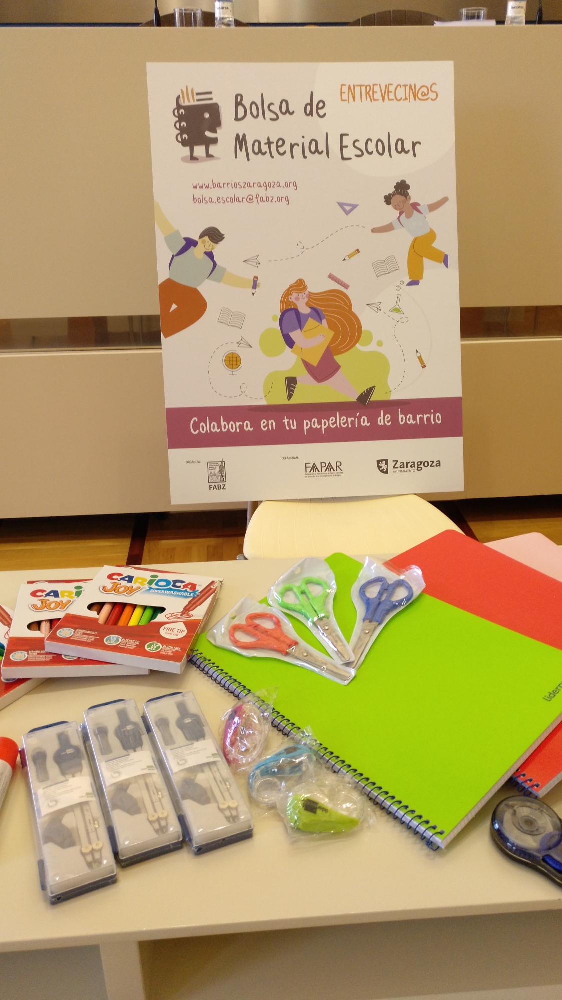 Ante la actual crisis sanitaria, la FABZ está poniendo en marcha un proyecto social de recogida de material escolar para su posterior distribución a familias económicamente vulnerables, readaptando el programa Entrevecin@s a través del convenio que mantiene con el Área de Acción Social del Ayuntamiento de Zaragoza, y en coordinación con FAPAR.