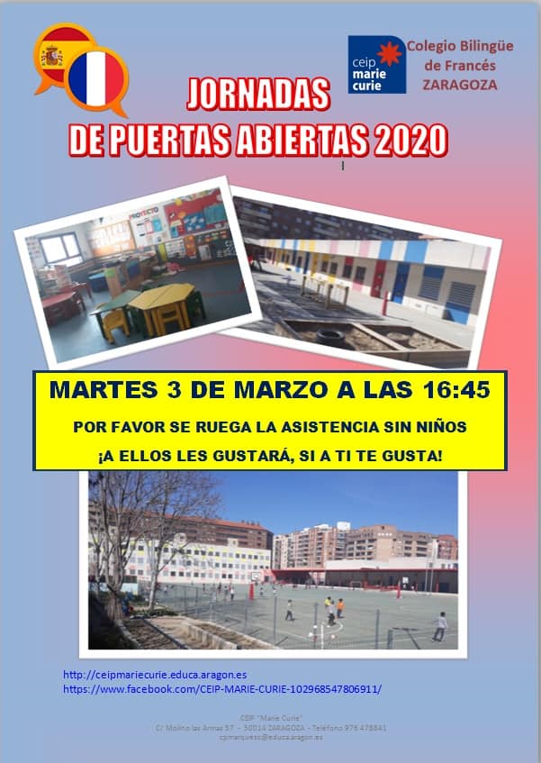 | CEIP Marie Curie | C/ Molino de la Armas 57 | 976 47 88 41 | 3 de Marzo | 16:45 horas |