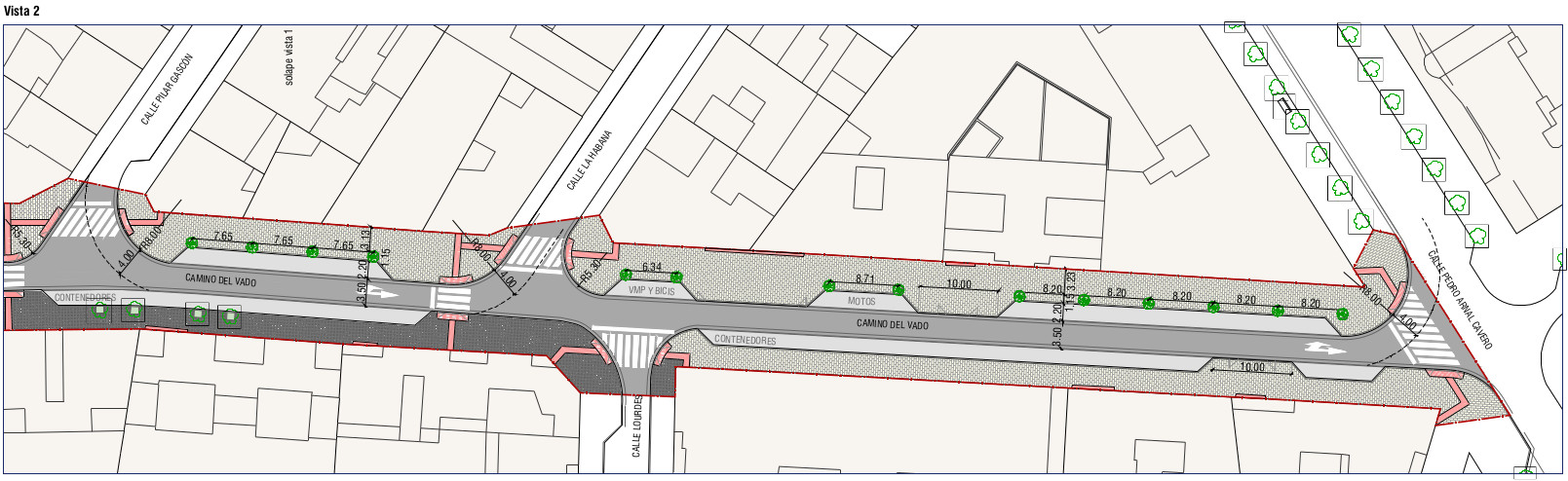 Se creará un único carril circulación con una anchura 3,50 m. y dos bandas de estacionamiento en ambos lados de la calle de ancho 2,20 m. intentando mantener, en la medida de lo posible, el estacionamiento y las zonas de carga y descarga existentes..