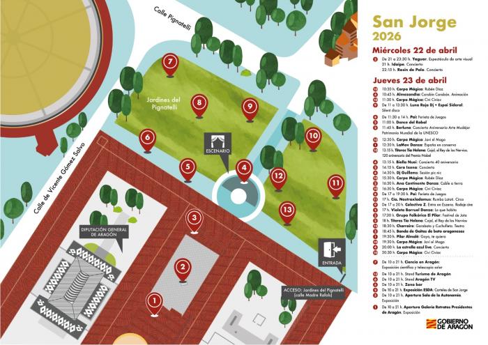 Las actividades, que comenzarán el miércoles 22, a las 21:00 horas, en el patio de la Sala de la Corona, con una video proyección de Yaguar Visual Art con imágenes que evocarán la celebración del Día de Aragón acompañadas de dos conciertos de artistas aragoneses Idoipe y Rosin de Palo.