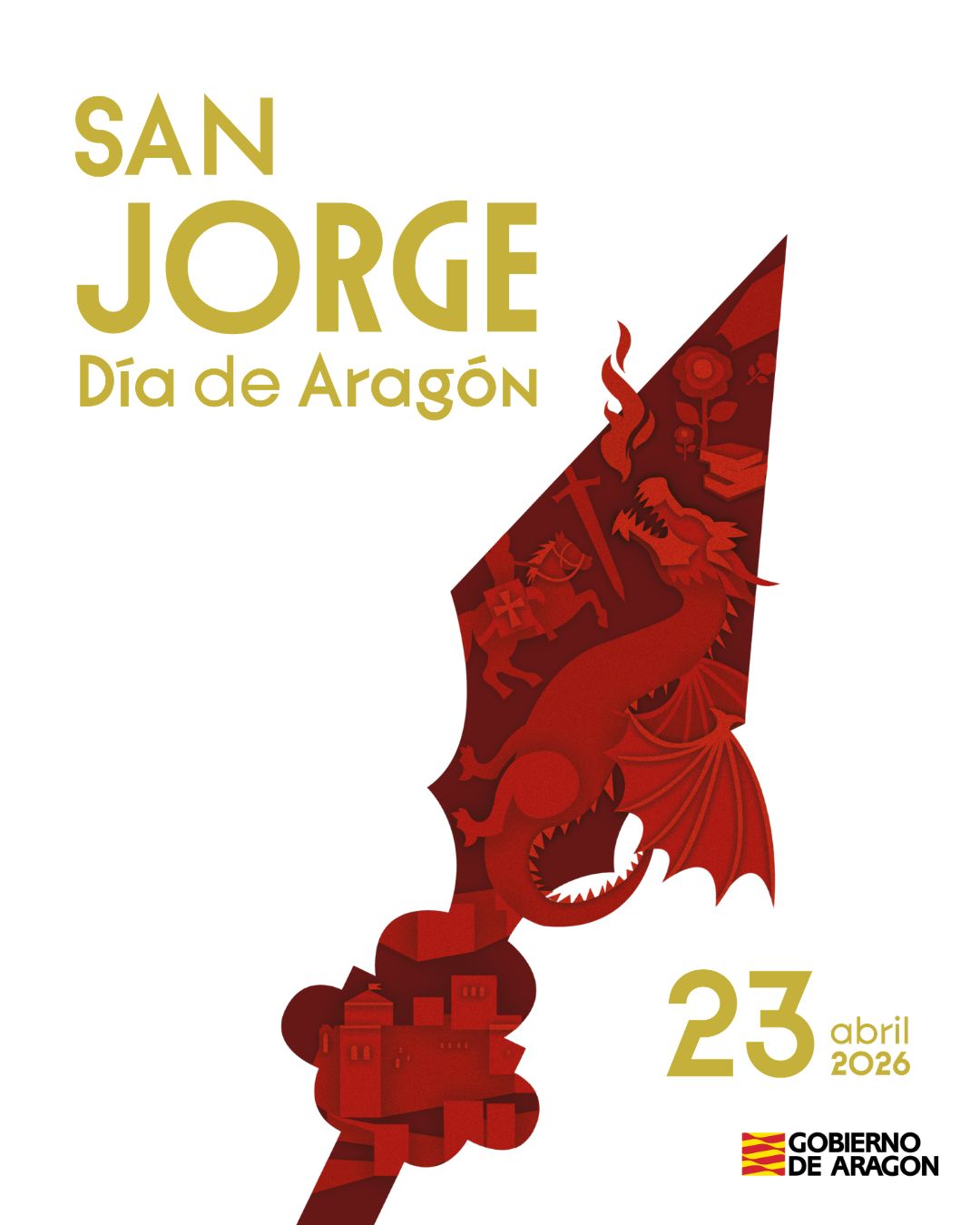 El cartel anunciador este año de la festividad de San Jorge es obra de Marina Buil Guardia, alumna de la Escuela de Diseño de Aragón, titulado “Donde la leyenda se hace historia”. Lo protagoniza la lanza de San Jorge, en colores rojos y sombreados, con imágenes representativas de la festividad: el dragón lanzando fuego, San Jorge con su caballo, una espada, flores, libros y un monumento representativo de nuestra historia. La lanza aparece sobre un fondo blanco en el que se puede leer en letras doradas ‘San Jorge Día de Aragón 23 de abril 2026’.